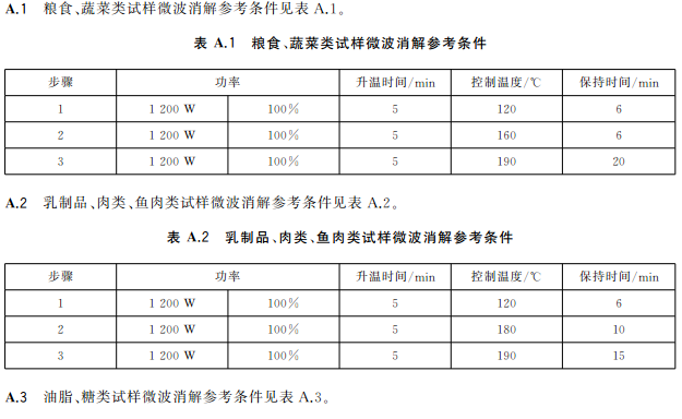 蔬菜、水果等含水分高的樣品,稱取2.0g~4.0g(精確至0.001g)樣品于消解罐中,加入5mL硝酸,放置30min;糧食、肉類、魚類等樣品,稱取0.2g~0.5g(精確至0.001g)樣品于消解罐中,加入5mL硝酸,放置30min,蓋好安全閥,將消解罐放入微波消解系統中,根據不同類型的樣品,設置適宜的微波消解程序(見表A.1~表A.3),按相關步驟進行消解,消解完全后趕酸,將消化液轉移至25mL容量瓶或比色管中,用少量水洗滌內罐3次,合并洗滌液并定容至刻度,混勻。同時作空白試驗。