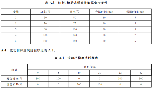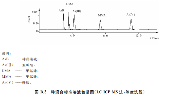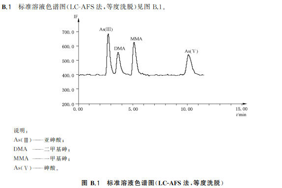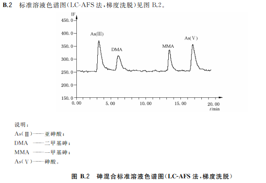 色譜柱:陰離子交換色譜柱(柱長250mm,內徑4mm),或等效柱。陰離子交換色譜保護柱(柱長10mm,內徑4mm),或等效柱流動相組成a)等度洗脫流動相:15mmol/L磷酸二氫銨溶液(pH6.0),流動相洗脫方式等度洗脫。流動相流速:1.0mL/min;進樣體積:100!L。等度洗脫適用于稻米及稻米加工食品b)梯度洗脫:流動相A:1mmol/L磷酸二氫銨溶液(pH9.0);流動相B:20mmol/L磷酸二氫銨溶液(pH8.0)。(梯度洗脫程序見附錄A中的表A.4。)流動相流速:1.0mL/min;進樣體積100μL。梯度洗脫適用于水產動物樣品、含水產動物組成的樣品、含藻類等海產植物的樣品以及嬰。