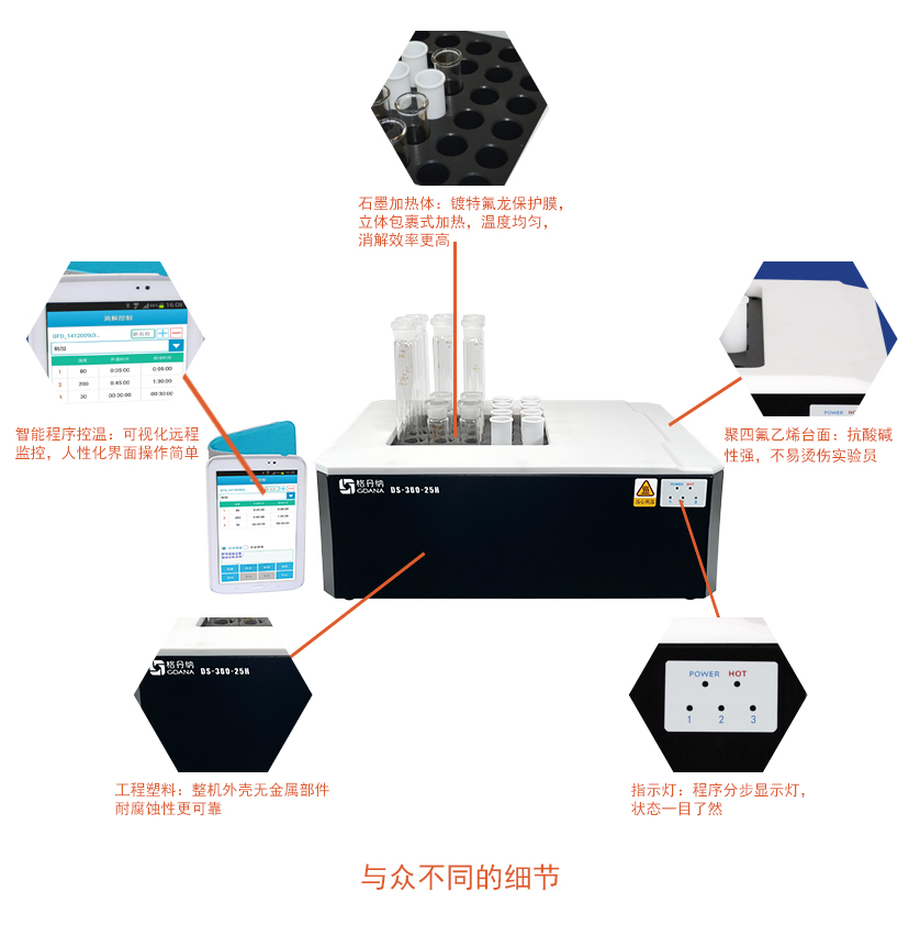 儀器的內殼采用雙層隔熱結構知識產權技術,內外殼設計,具有優秀的隔熱特點,高溫消解時,外殼更安全。